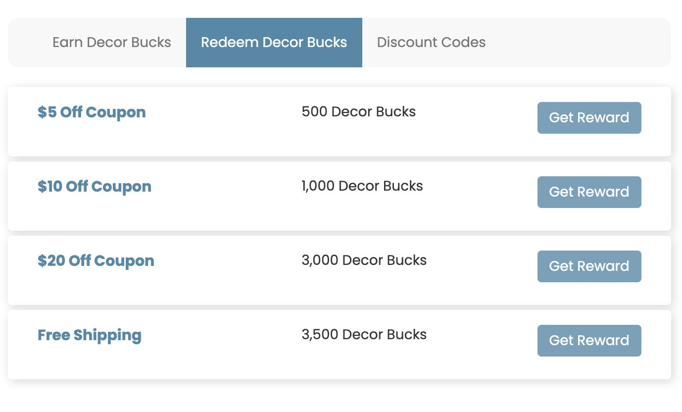Decor Bucks are our store's very own loyalty points system, giving you access to exlcusive discounts, offers, and products for every dollar you spend!